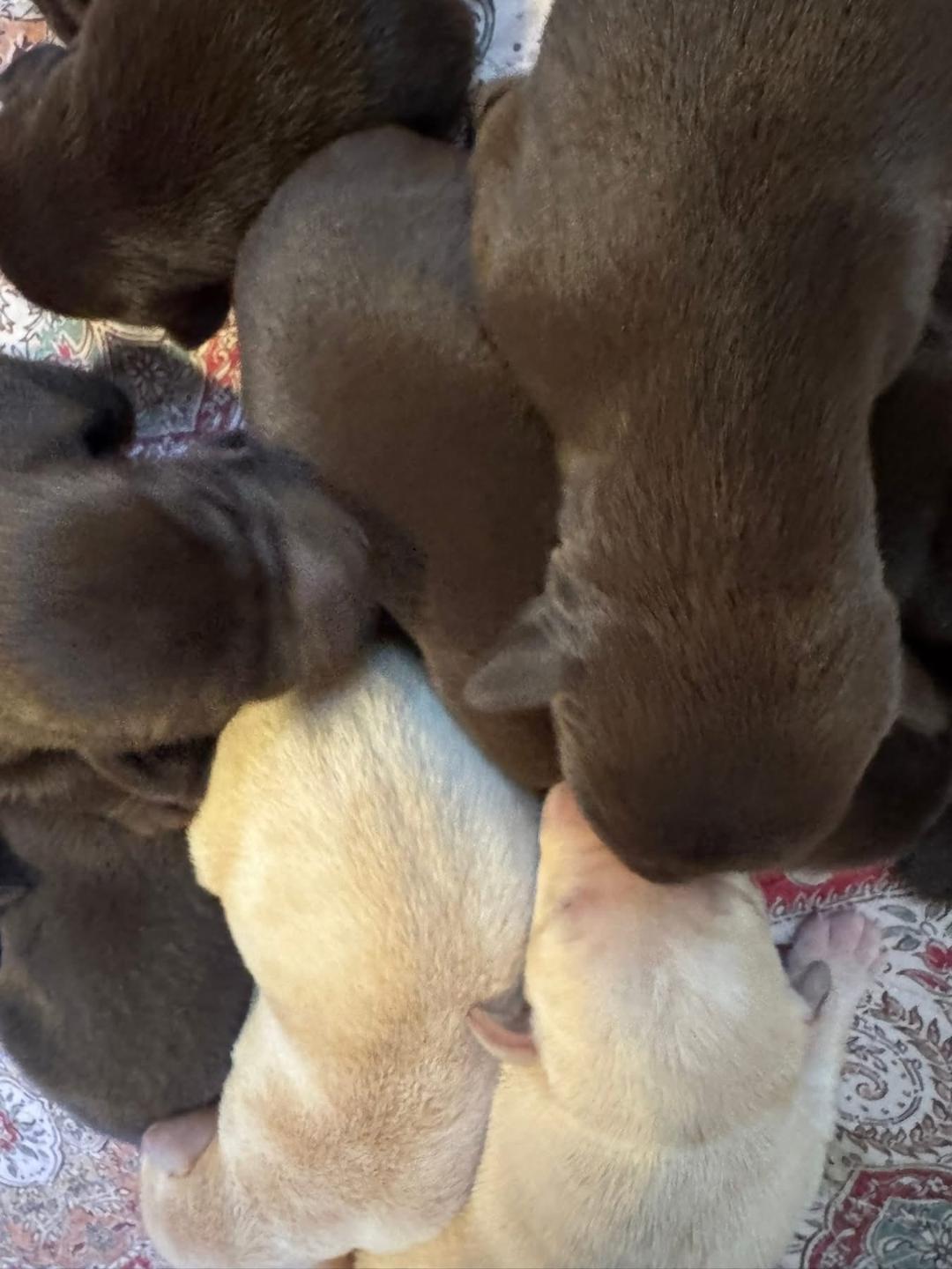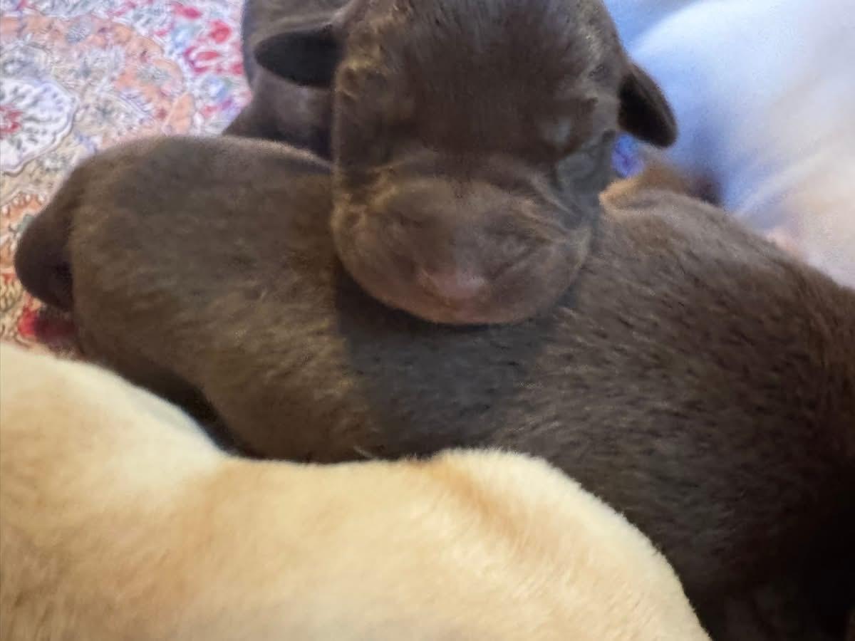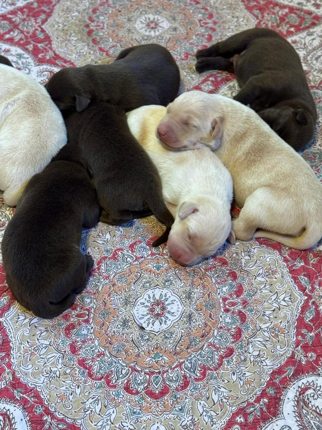 The beautiful black and yellow puppies are Bree/Radley pups that arrived 9/29. this breeding presents 14 National Field champions in his 4 generation pedigree.